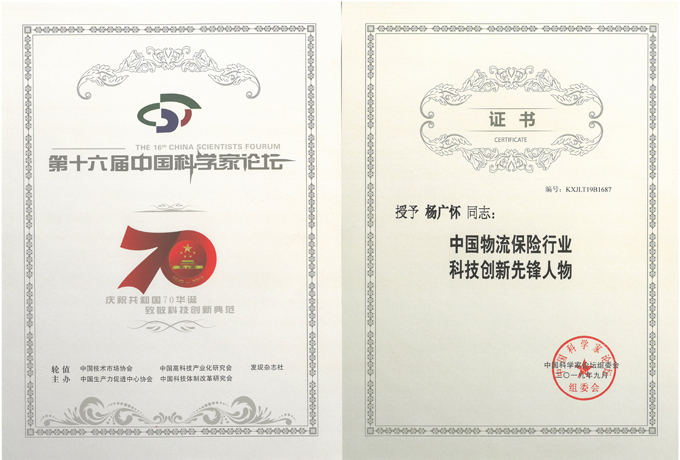中国物流保险行业科技创新先锋人物-证书